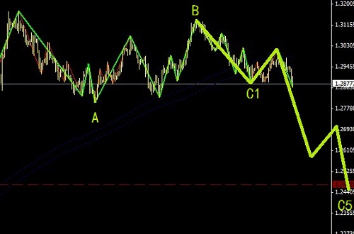 目前最為配合的為歐元,的確歐元的波浪理論形態是很標準的,平臺型調整的B浪,然后是引導楔形構成了C浪1,后面可以繼續追空,見macd背離好出場……